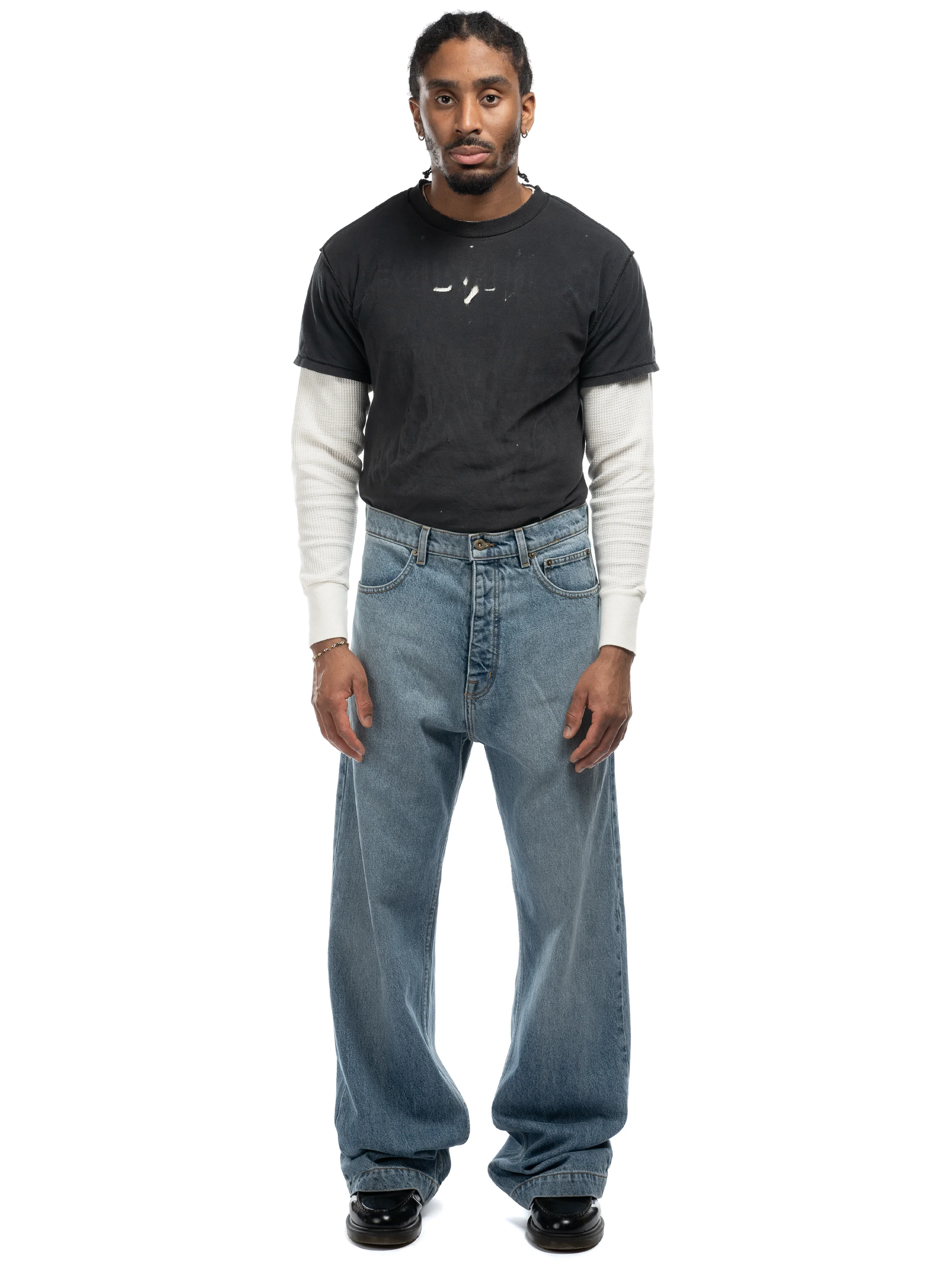 - Heavyweight, stone washed oversized fit denim in washed indigo.